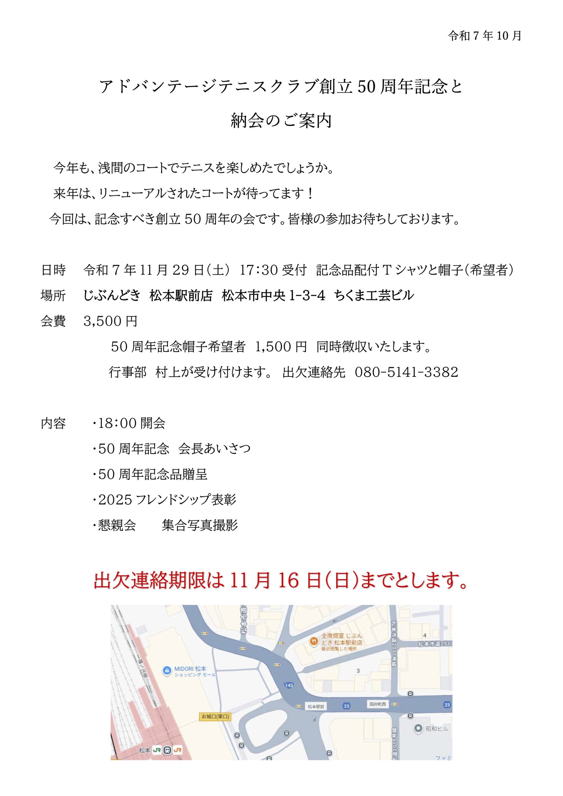 Warning: unlink(/home/c2787875/public_html/advantc.com/wp-content/lolipop-migrator//.htaccess): No such file or directory in /home/c2787875/public_html/advantc.com/wp-content/plugins/lolipop-migrator/includes/class-lolipop-migrator-file.php on line 47 創立50周年記念・納会のご案内 – Advantage Tennis Club