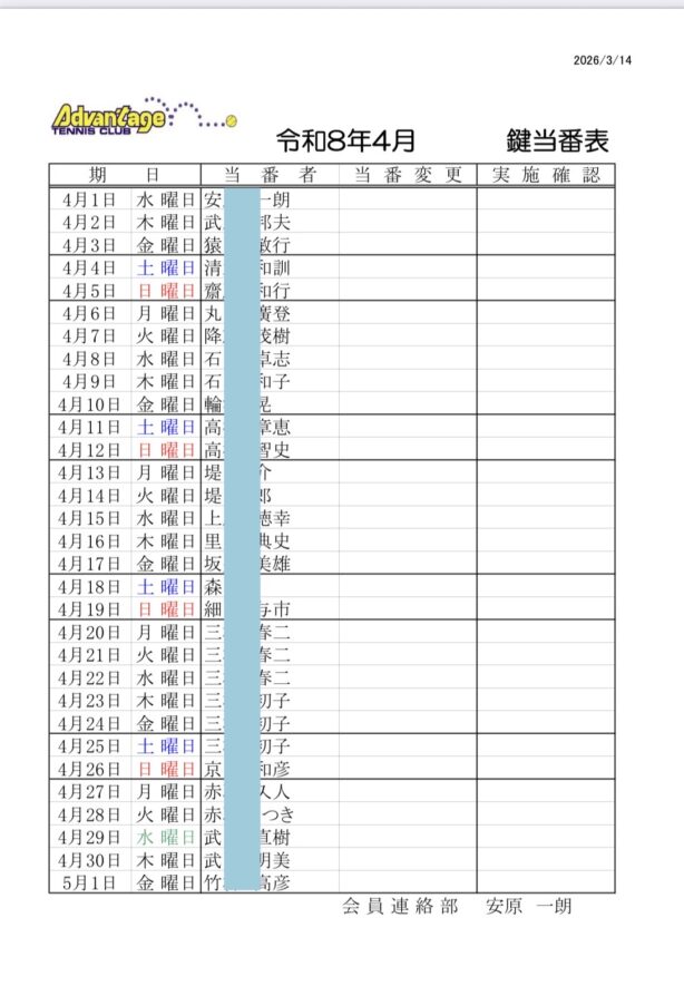 当番の方はコートの開閉、テーブル準備などご協力をお願いいたします。
